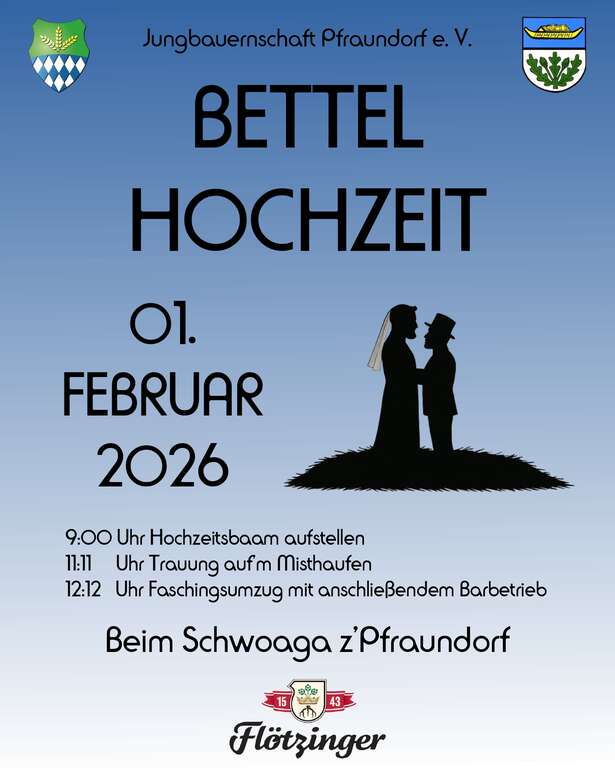 Am 01.02.2026 findet unsere langersehnte Bettelhochzeit in Pfraundorf statt.
